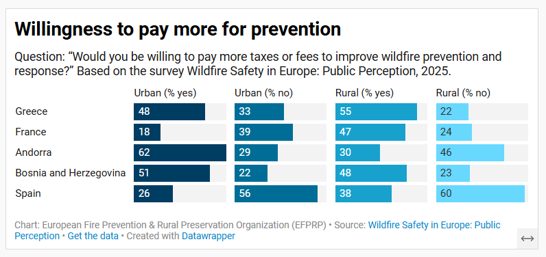 Now, in Spain, a country familiar with large seasonal fires, respondents’ high concern yet moderate willingness to pay more may stem from economic pressures and a well known long standing expectation that the state should lead prevention efforts.