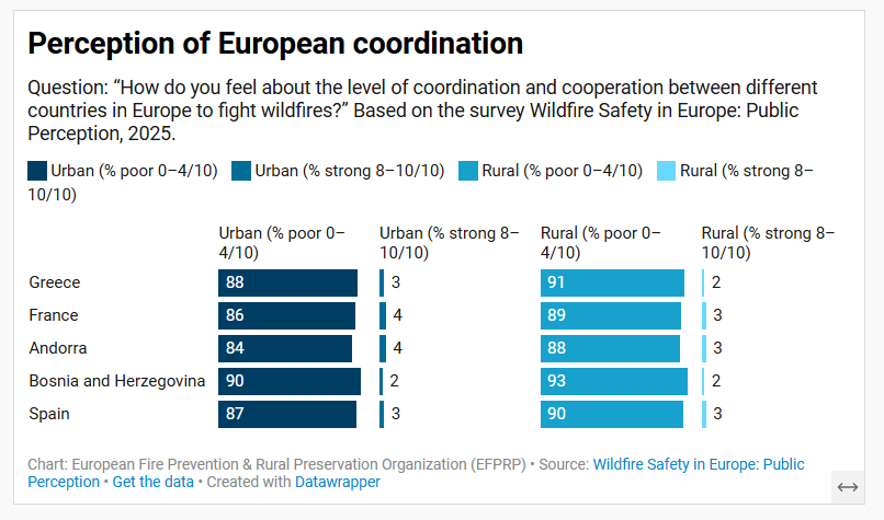 A striking 86–93% of all respondents perceive poor European coordination on wildfire management.